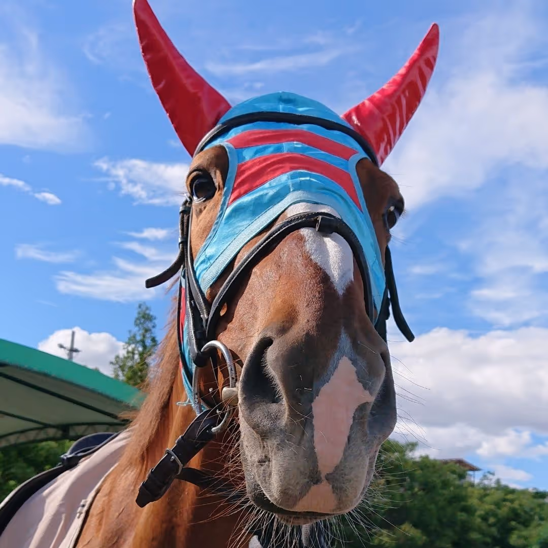 引退後は乗馬になるためのトレーニングを積み、現在はクレイン大阪でたくさんの方の乗馬ライフを豊かなものにするべく、「タマモ」おなじみのメンコをつけてがんばっています!