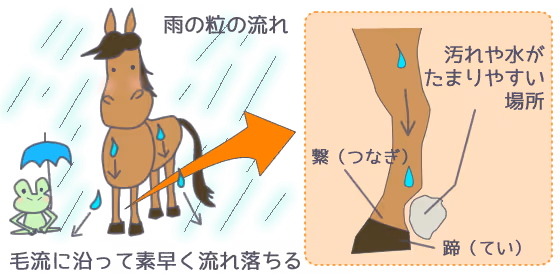 上半身から流れてきた水の一部は、肢へと流れていきます。球節、繋、かかとへと流れてきた水は、かかとのくぼんだ部分に溜まりやすく、それが原因で皮膚トラブルになることがあります。雨にあたった際には、ここをきれいにふき取ってあげると安心です。