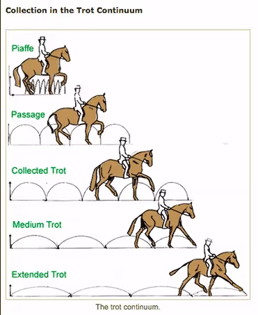 少し専門的な言葉が多くなってきましたが、少しイメージしてみてください。畑は違いますが、競馬で走っている馬たちは目いっぱい体を伸ばして飛ぶように走っています。逆に馬場馬術はピアッフェと呼ばれる、その場で足踏みをしているような動きを求められることも(下図一番上のイラスト)。前に進もうというエネルギーを収縮してその場に留めます。
