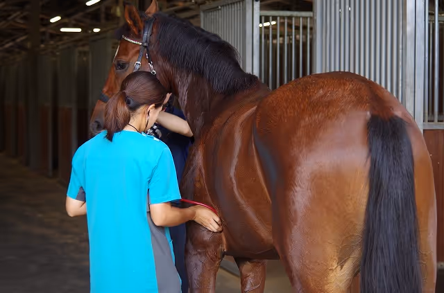 獣医検査では、心拍数、代謝機能、歩様などをチェックされます。選手は各フェイズのゴールを切った後、馬体を冷やしたり、馬に水を飲ませたり、獣医検査場に入る前に馬の調子を整えます。歩様検査は下記動画のように馬を走らせてチェックします。